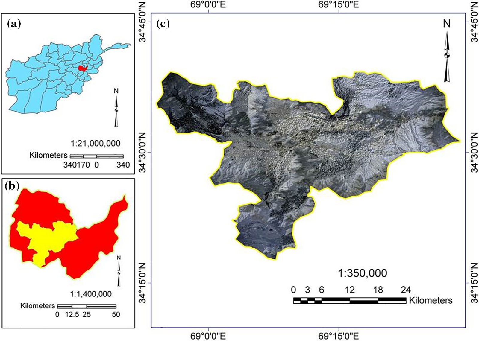 Fig. 1. Location map of the study area: (a) Kabul province in Afghanistan, (b) Kabul city in Kabul province, and (c) Kabul city.