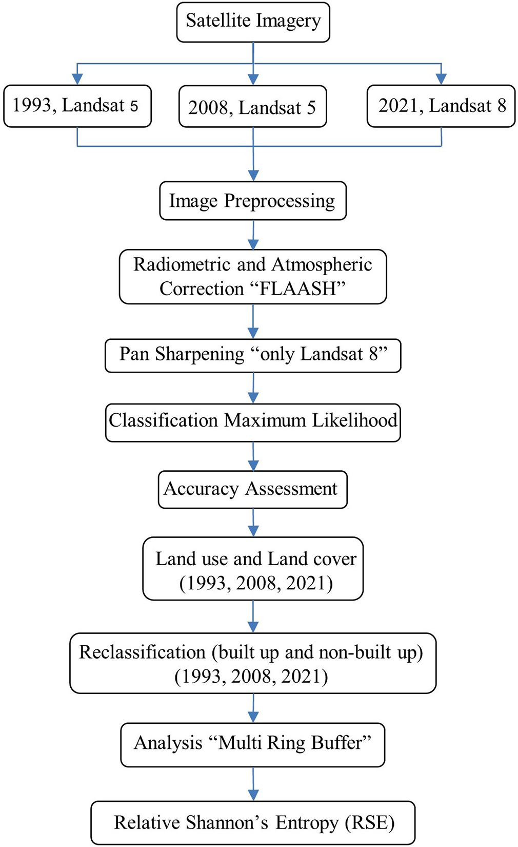 In this research, urban sprawl and the dynamic changes of urban built-up areas of Kabul city were evaluated. The city of Kabul has experienced a significant population increase due to various reasons, such as increasing migrations from abroad and from neighboring provinces to the city of Kabul. On the other hand, from a geomorphological and topographical point of view, the city of Kabul is surrounded by mountains. Geomorphological and topographic factors have played a significant role in urban sprawl. Shannon’s entropy was used to measure urban sprawl and the dynamic changes of the built areas of the city and to identify the characteristics of urban sprawl. Landsat-5 TM from August 2, 1993, Landsat-5, August 23, 2008, and Landsat-8 OLI/TIR from July 4, 2021, were used to detect urban sprawl. In this research, a nine-year interval between the data of two periods has been used to evaluate the urban sprawl and the dynamic changes of the built-up area of the city. The specifications of satellite images are shown in (Table I). Landsat-5 for 1993 and 2008, and Landsat-8 for 2021. Further processing of satellite images was done in ENVI and ArcGIS Pro programs. Satellite images need to be atmospherically corrected before processing. Therefore, the FLAASH algorithm was used to make atmospheric corrections. ENVI 5.6 software was used to apply the pre-processing step. The methodological flow chart for this study is shown in Fig. 2.