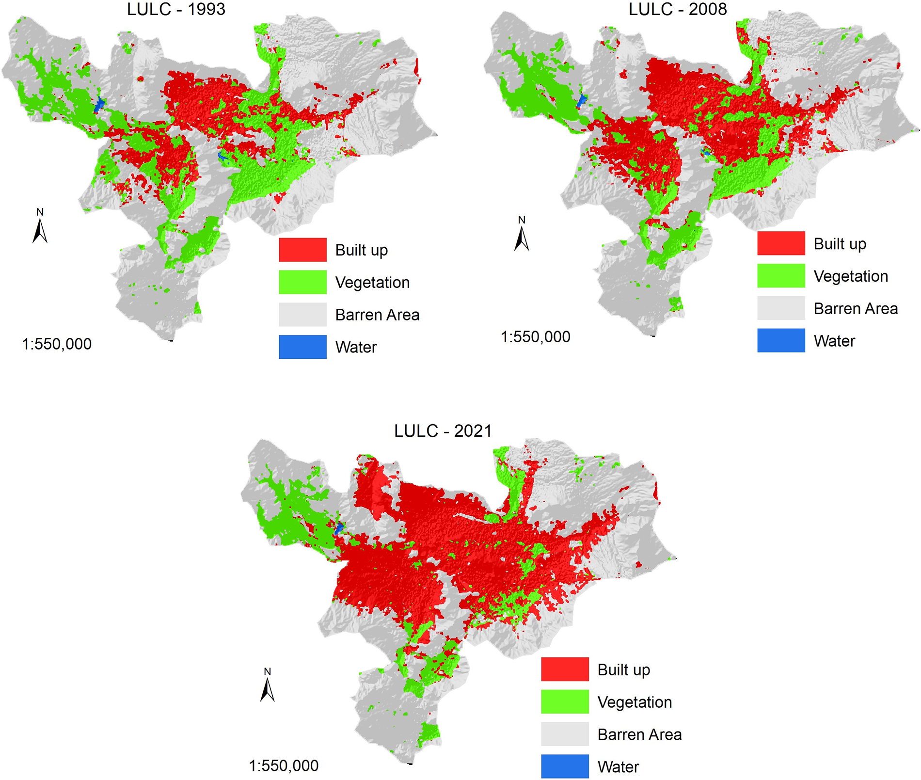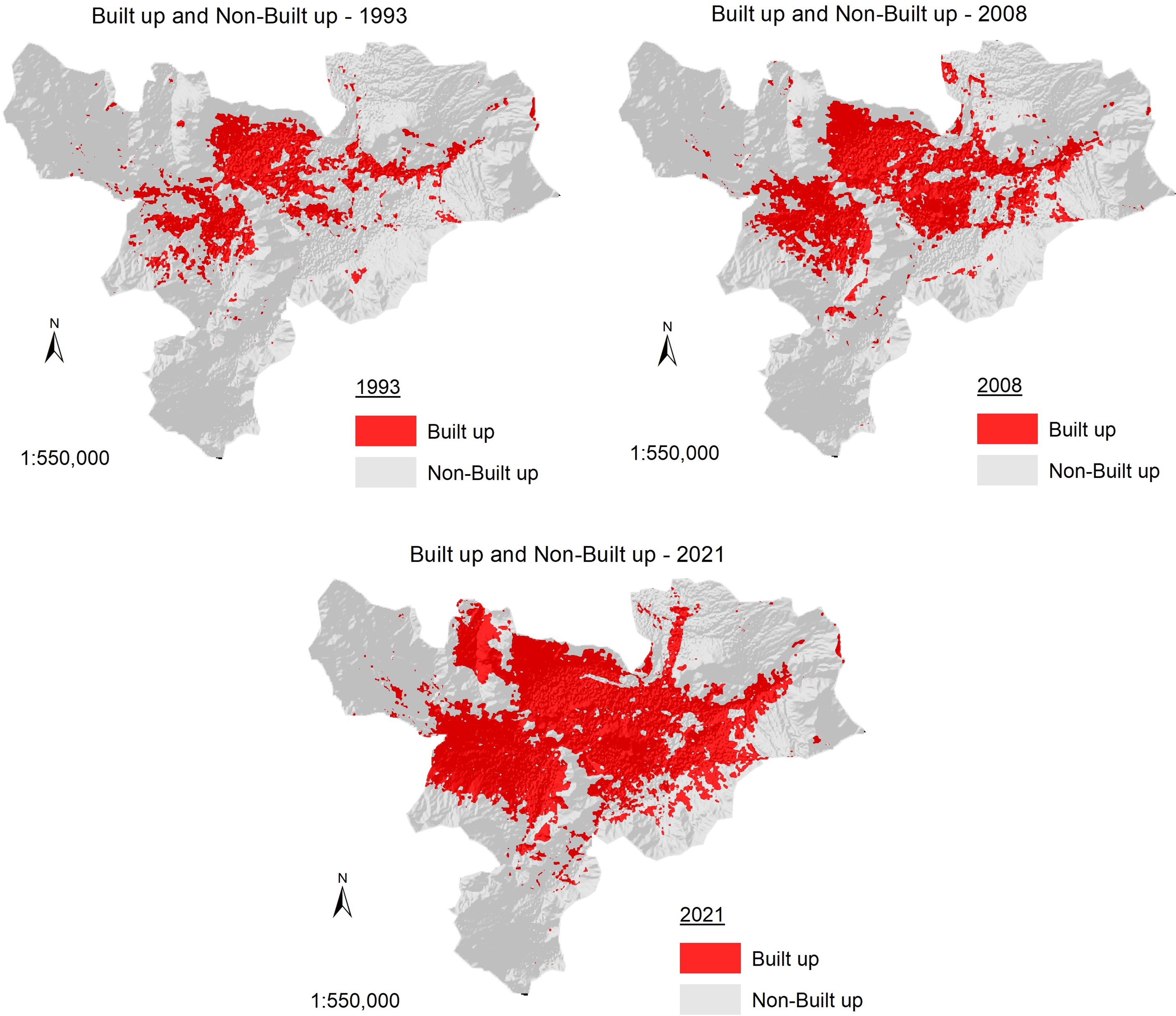 Prior to classifying the Landsat satellite images, pre-processing activities were carried out, and all images were aligned with the UTM-WGS84 coordinate system. The rectified images were then subject to classification, categorizing into four classes: built-up areas, vegetation, barren areas, and water. This classification was accomplished using the support vector machine-supervised classification algorithm. For the purposes of this current study, these classes were further reclassified into built-up and non-built-up areas. This reclassification served to evaluate the changes in urban development and urban sprawl throughout the entire study period. The images were initially categorized into two groups: built-up areas and non-built-up areas. The built-up category encompassed subdivisions, roads, streets, airports, housing, and commercial or industrial zones, while the non-built-up category included vegetation, barren land, water bodies, soil, and mountainous regions. Following this reclassification, smoothing was applied to the images representing built-up and non-built-up areas for all three time periods, namely, 1993, 2008, and 2021. The study included a classification accuracy assessment to gauge the precision of the classified maps and assess the effectiveness of the classifier algorithm. In this research, the Kappa coefficient was employed to evaluate the accuracy of the land use and land cover maps. This evaluation involved the selection of over 300 control points on the classified maps. The kappa values are 0.86, 0.89, and 0.91 for the years 1993, 2008, and 2021, respectively. According to [2], a higher than 0.85 Kappa coefficient indicates strong agreement between images.
