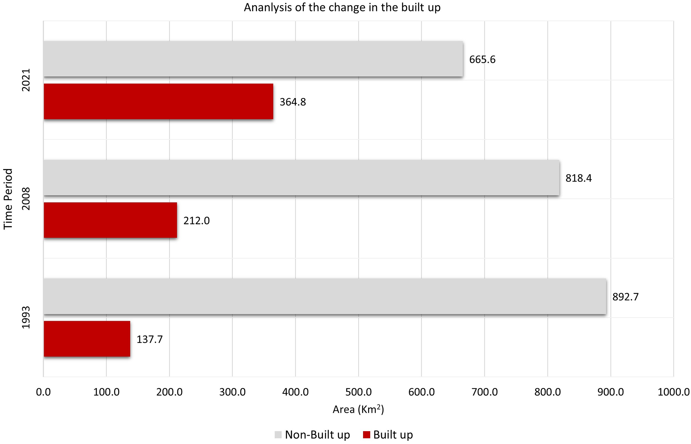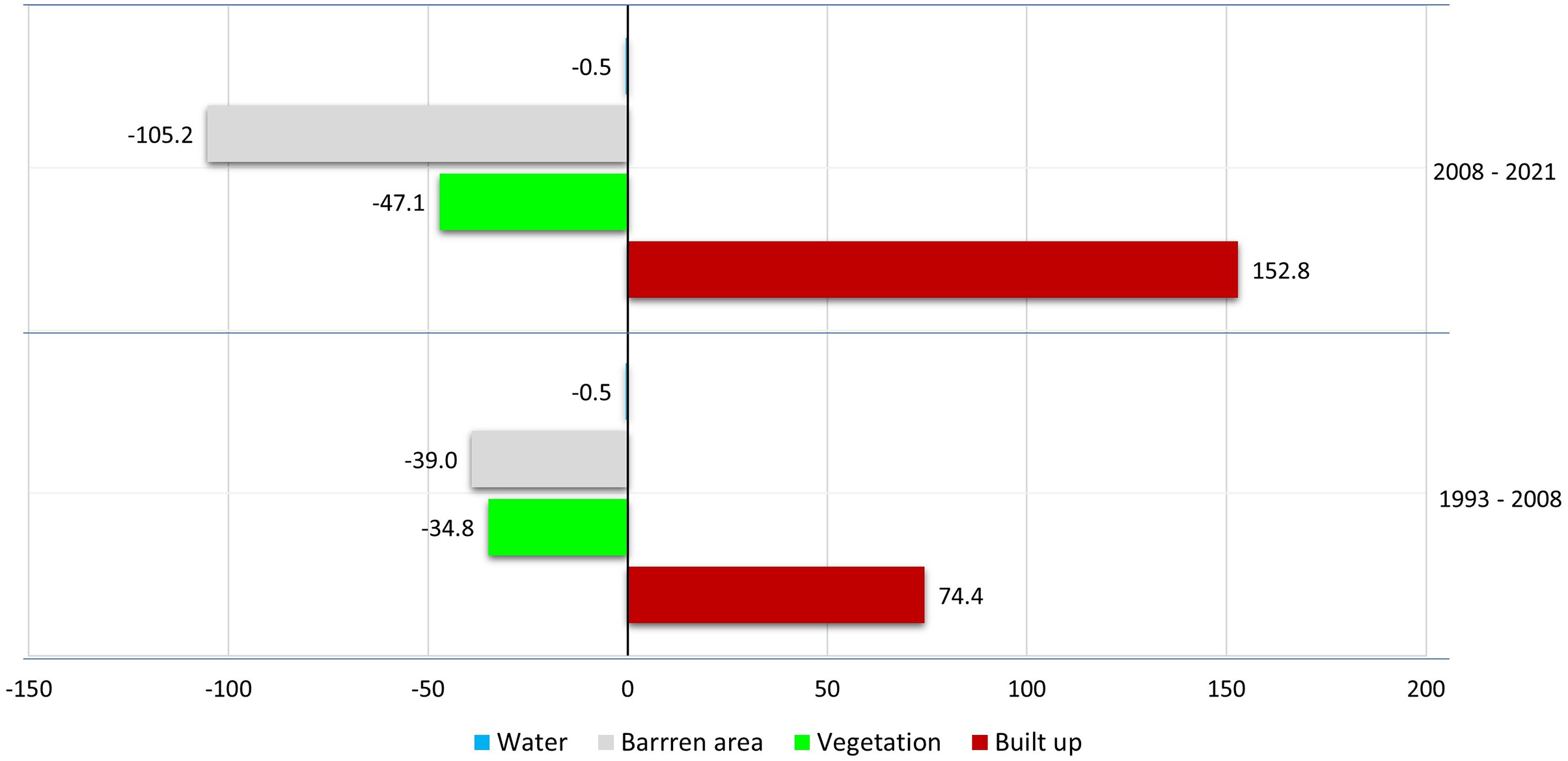 According to Table III and Fig. 4, the built-up area increased significantly from 137.7 km2 to 212.0 km2 between 1993 and 2008, which shows 74.4 km2 (54.0%+) expansion. At the same time, during this period, a decrease in vegetation cover was also observed, the vegetation cover decreased from 208.4 km2 to 173.7 km2 between 1993 and 2008, which demonstrates 34.8 km2 (16.7%−) reduction. Furthermore, the barren area decreased from 682.4 km2 to 643.3 km2 between 1993 and 2008, which shows 39.9 km2 (5.7%−) reduction. The built-up area increased dramatically from 212.0 km2 to 364.8 km2 between 2008 and 2021, which indicates 152.8 km2 (72.1%+) increasing, while the vegetation cover decreased from 173.7 km2 to 126.6 km2 between 2008 and 2021, which demonstrates 47.1 km2 (27.1%−) decline. On the other hand, the barren area declined from 643.3 km2 to 538.1 km2 between 2008 and 2021, which shows 105.2 km2 (16.4 %−) reduction. Based on the overall assessment, the outputs revealed that, between 1993 and 2021, the built-up area drastically developed from 137.7 km2 to 364.8 km2, which shows 227.2 km2 developments, while the vegetation area decreased from 208.5 km2 to 126.6 km2, which shows 81.9 km2 declines.