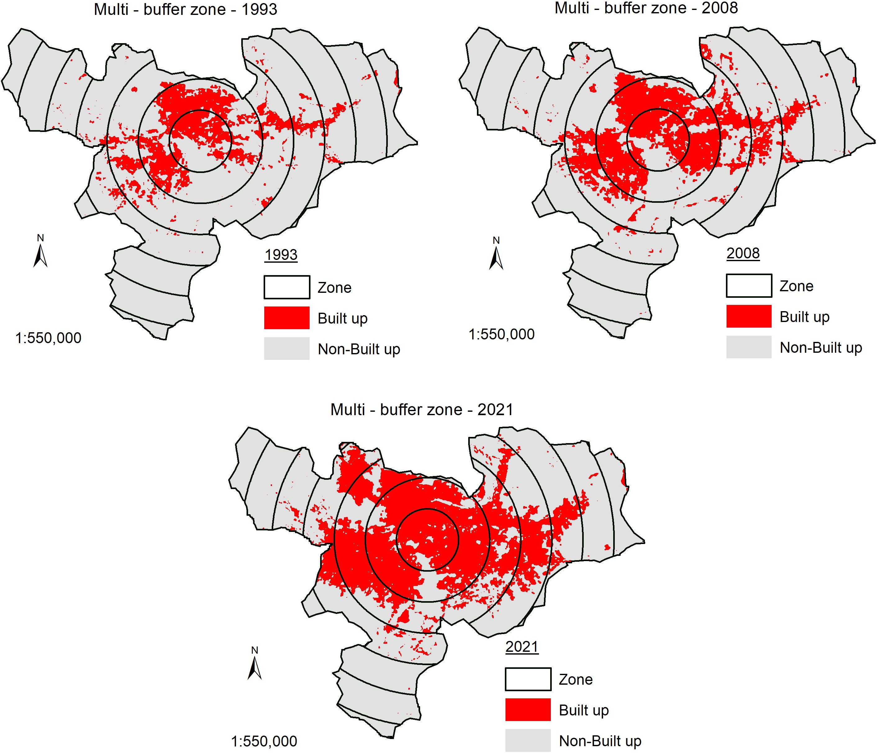 In this study, various geospatial analysis techniques, including the use of multi-ring buffers, reclassification, zone statistics, and Relative Shannon’s Entropy (RSE), were employed to assess urban sprawl. To evaluate the density and expansion of built-up regions in the study area across three distinct time periods, the images were first reclassified into built-up and non-built-up areas, and corresponding maps were generated. This approach was consistently applied to all the selected images from 1993, 2008, and 2021. In order to compute the Shannon entropy values that determine the compactness or dispersal of the built-up areas, a multi-ring buffer analysis was conducted on the maps representing the built-up and non-built-up areas within ArcGIS Pro.