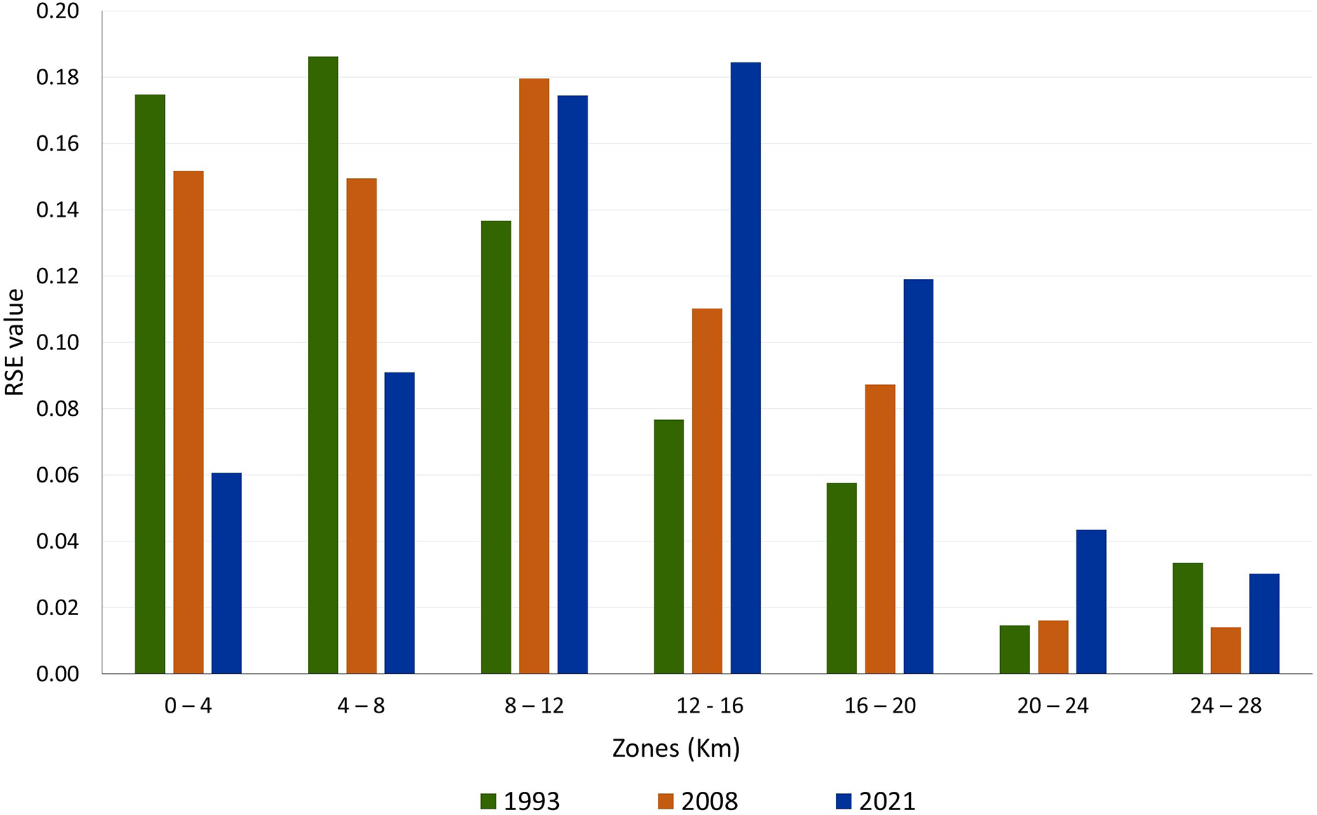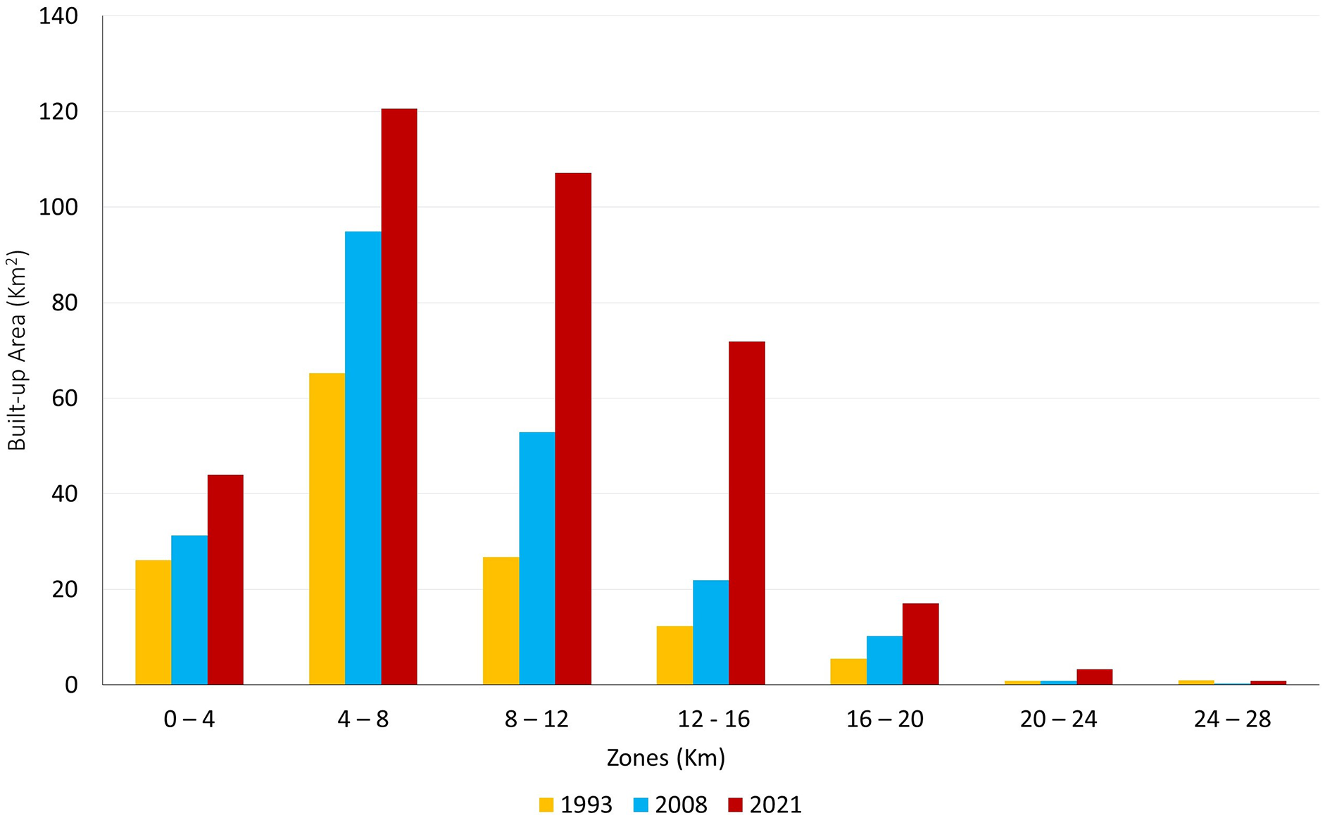 Based on Table VI, Figs. 7 and 8, the outputs revealed that, in 1993 and 2021 the first zone (0–4 km) was the most urbanized and populated among all other zones, within this zone the built-up area was 26.1 km2 and 43.9 km2, respectively. Whereas, in 2008 outputs revealed that the second zone (4–8 km) was the most urbanized and populated among all other zones, within this zone the built-up area was 94.9 km2. Based on the overall evaluation the outputs demonstrated that the development of built-up area decreases with increasing distance from the city center.