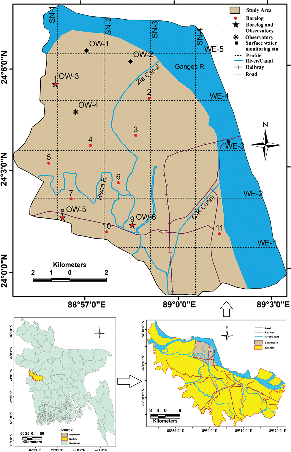 The current research area encompasses the Bheramara Upazila (Sub-district) within the Kushtia district (longitude: 88°54′47′–89°03′29′′ E and latitude 23°59′13′′–24°07′52′′ N), covering a total area of 150.49 km2, as depicted in Fig. 1. The primary surface water sources within this region include the Ganges and the Hisna, a distributary of the Ganges. The majority of the area is characterized by low-lying floodplains that have been shaped by alluvial soil deposition.