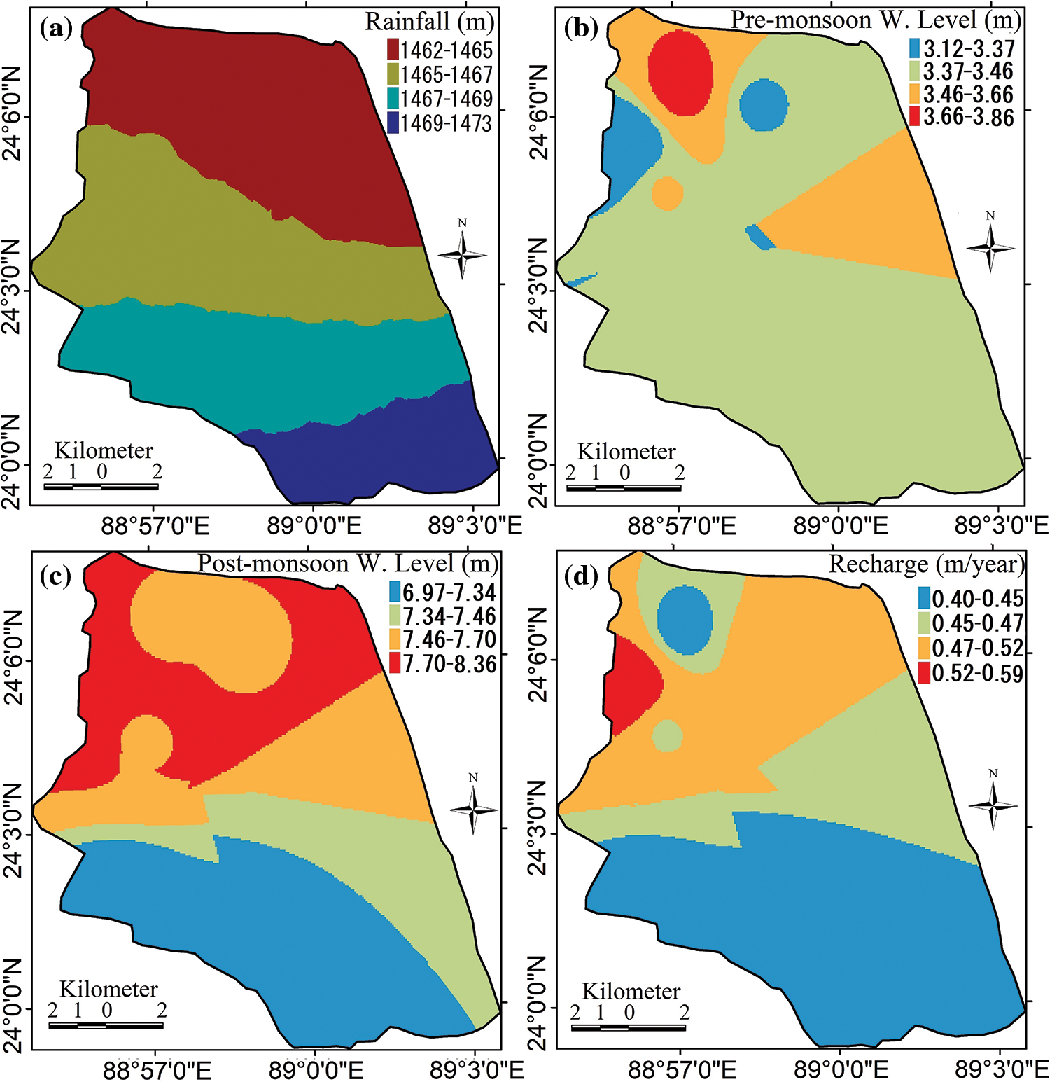 In this analysis, groundwater table rise from the end of pre-monsoon to the end of monsoon was utilized to estimate recharge. An area’s groundwater storage (Sgw) may be determined with the use of the following formula: (2)Sgw=Δh×Sywhere rising height is denoted by Δh, and specific yield per unit input formation by Sy. Data on groundwater levels collected from nine sites between 2012 and 2020 were used to calculate site-specific groundwater recharge using (2).