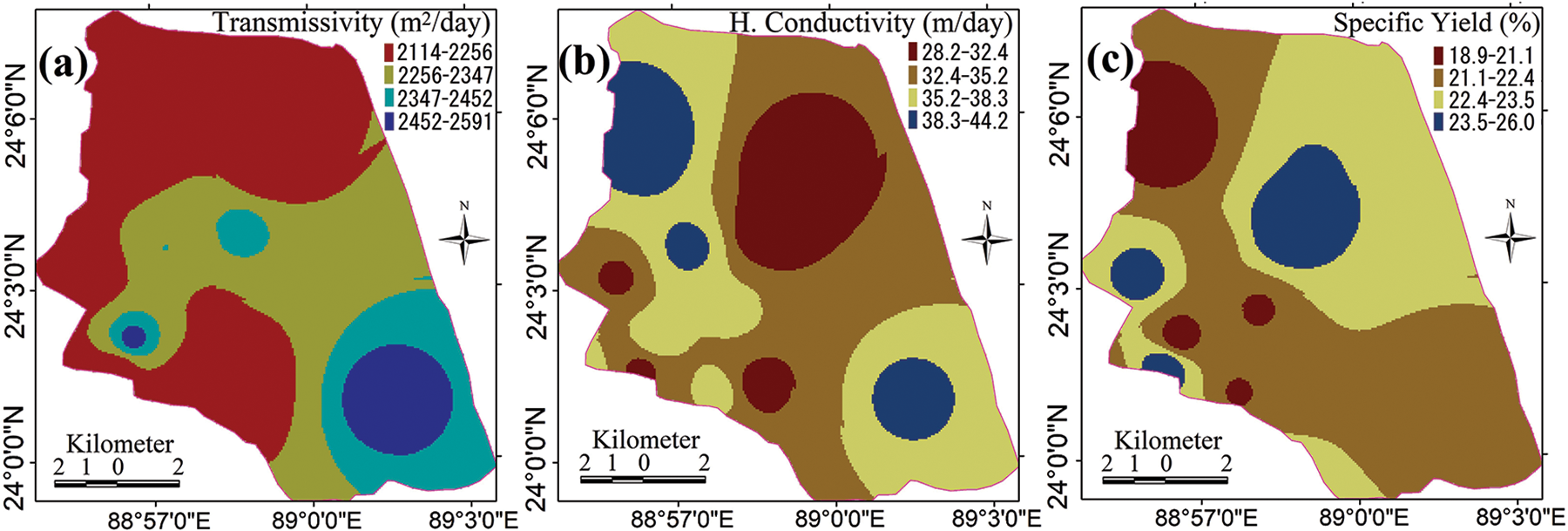 The aquifer’s storage coefficient and transmissivity, respectively, describe the expansion to which groundwater may be accumulated and transmitted via the cracks in the underlying geological structure. These properties can be estimated by analyzing data from single-well aquifer tests. However, in this study, the aquifer parameters were estimated using standard values of aquifer hydraulic conductivity and specific yield.