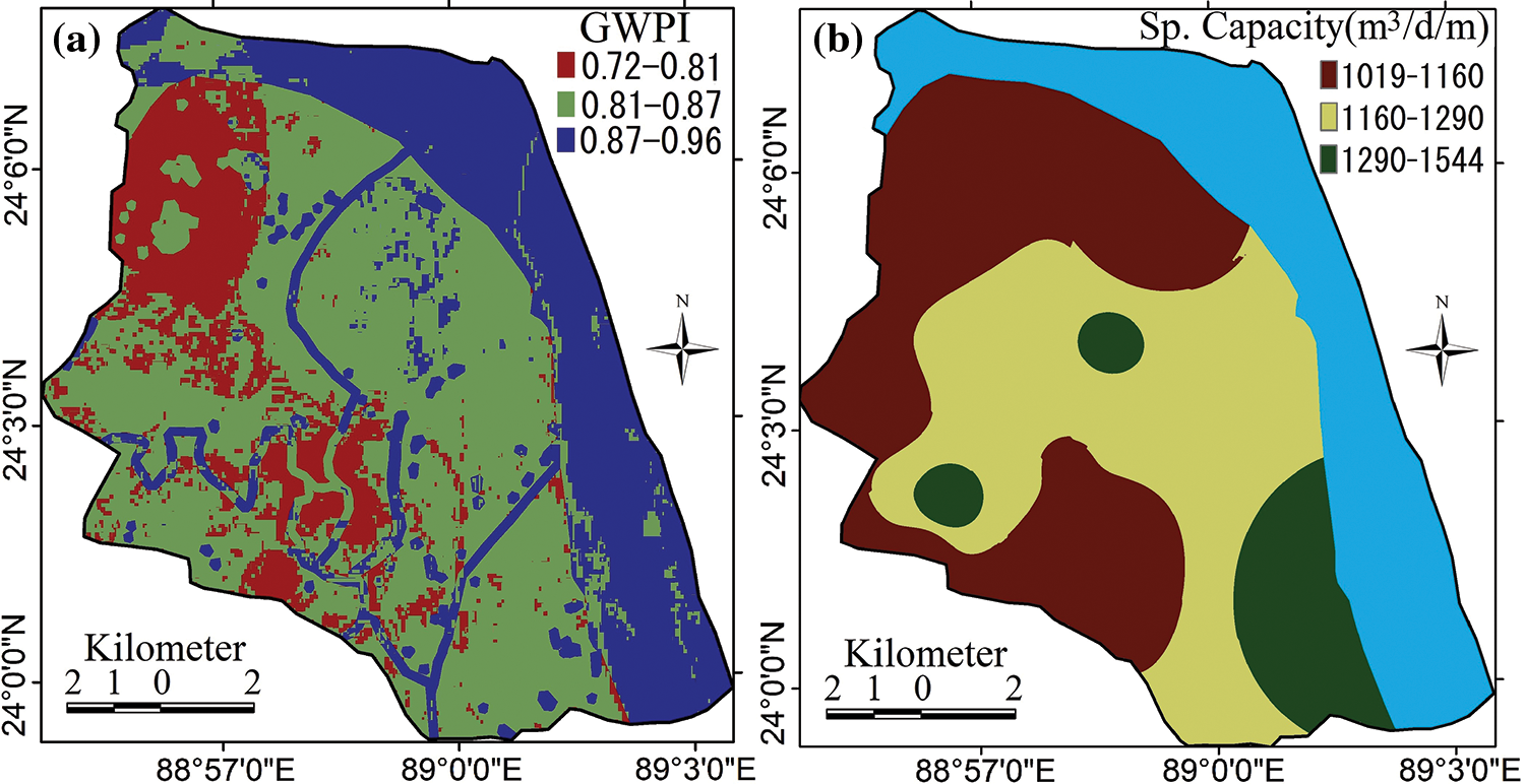 In this investigation, the validity of the GWPI model has been evaluated with the specific capacity estimated from available pumping test results (Fig. 8(b)). High specific capacity reflects high yield, and low specific capacity indicates low yield. Fig. 8(a) and Fig. 8(b) show that the area with lower specific capacity reflects the lower GWPI and vice-versa with a little discrepancy due to low data points.